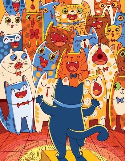 På puslespilsbilledet ser du en gruppe katte, der synger i kor. Den grå kat i forgrunden er lederen af koret, og de andre katte følger ham. Kattene forbereder sig til en korkonkurrence, og de har brug for al den energi, de kan få. Katten, som er korets dirigent, har købt fisk til sin gruppe. Desværre har en af de grådige katte spist alle fiskene, og der er kun én fisk tilbage. Kan du finde den skjulte fisk i koret på 12 sekunder?