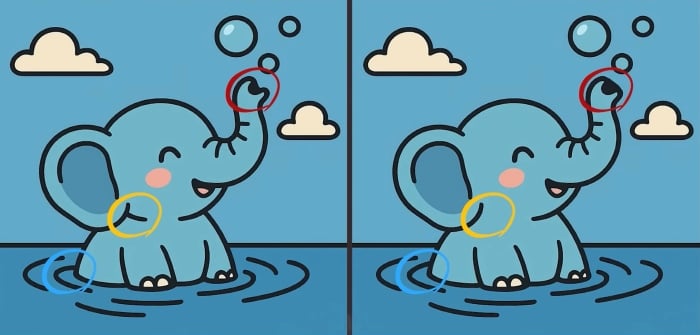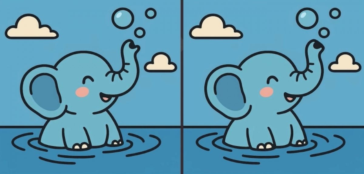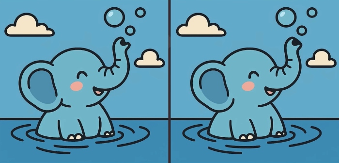 Foran dig er der to billeder af en elefant, der leger i vand. Ved første øjekast ser de helt ens ud, men det er bare en illusion. Der er tre små forskelle gemt i billederne.