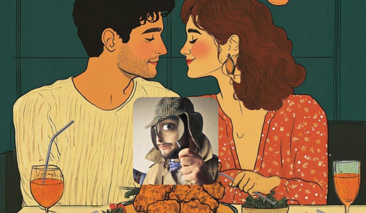 Foran dig står en forelsket mand og kvinde og snakker hyggeligt sammen under en romantisk middag. Pigen er klædt i en elegant kjole, og manden i en let trøje. På bordet står glas med drikkevarer og flere lækre retter. Der hænger malerier på væggene i etablissementet, og der hænger lyspærer ned fra loftet.