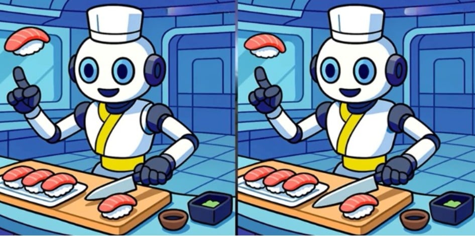 Billederne her viser en sushi-robot. Ved første øjekast ser de to billeder helt ens ud, men der er tre små forskelle mellem dem.