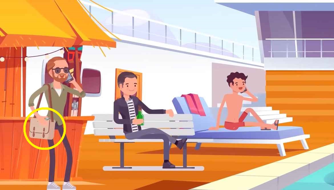 Tyven er fyren med briller, fordi han stjæler bestik fra buffeten ved poolen.