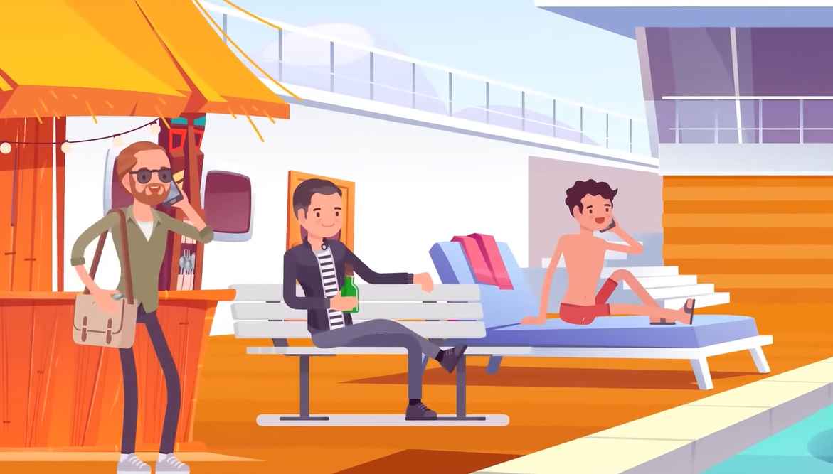 Hver af fyrene har travlt med sine egne ting – nogle taler i telefon, og andre nyder bare en stille stund ved poolen med en drink i hånden.