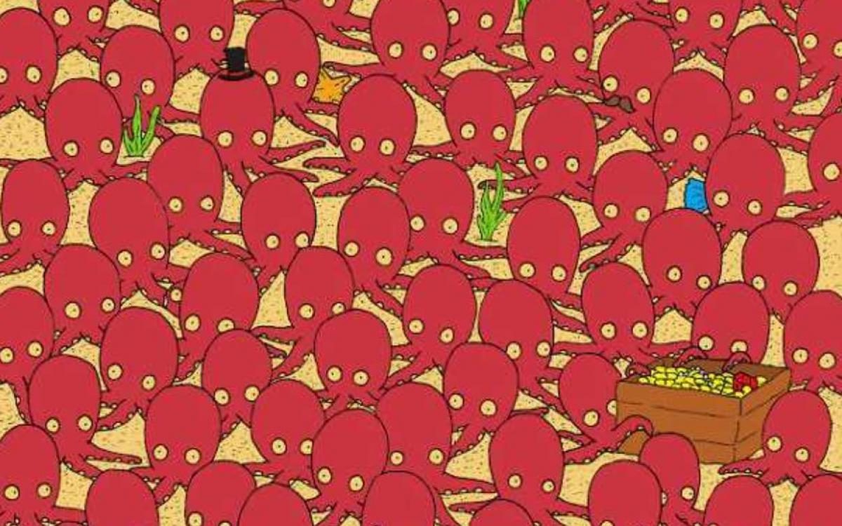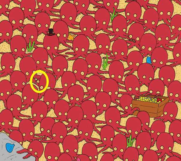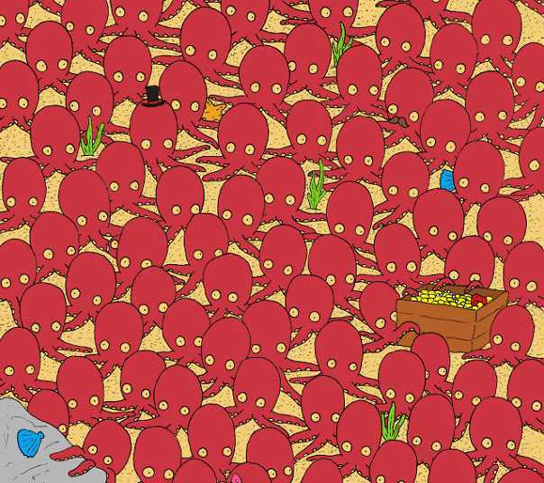 Prøv at løse en udfordrende, men sjov optisk illusion – fisken blandt blæksprutterne er godt skjult, og du skal stadig prøve at finde den.