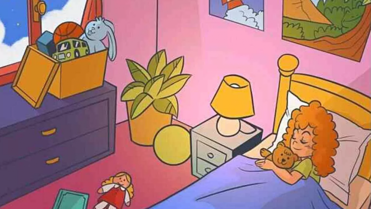 Billedet er af en pige, der sover i sit soveværelse. Hun krammer en bamse, til højre for hende er der en dukke, en notesbog, og i hjørnet på skabet er der en kasse med andet legetøj. Din opgave er at finde ud af, hvor frøen er. Den gemmer sig ret tæt på.