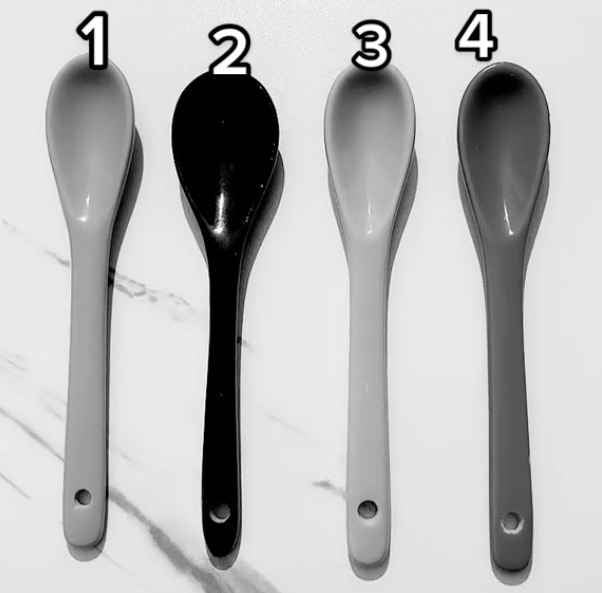På billedet ser vi fire skeer, som utvivlsomt har forskellige farver. Men mætningen er fjernet fra billedet, hvilket gør det svært umiddelbart at forstå, hvilken farve hver af disse individuelle genstande har.