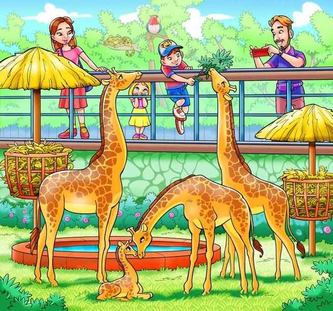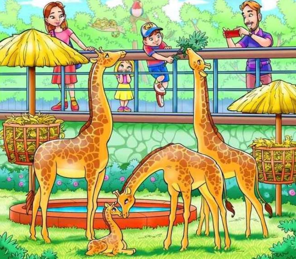 Billedet er af en familie i zoo. Manden filmer girafferne med sin telefon, og børnene og hans kone kigger på dyrene. Der gemmer sig en abe et sted, som du skal finde.