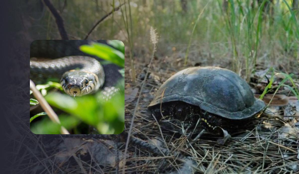 I dag tilbyder Moje dig at teste din opmærksomhed ved hjælp af et smukt foto. På billedet kan du se en stor skildpadde skjult i skjoldet. Den er omgivet af tørt og grønt græs, grene og træer.