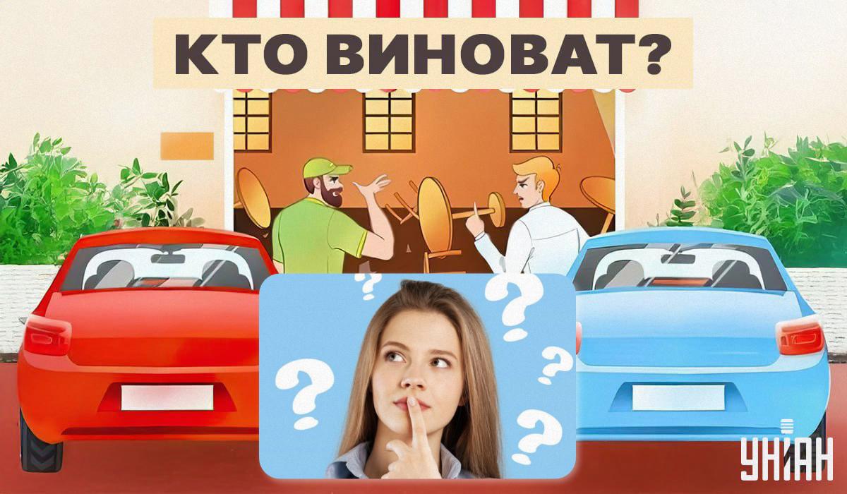 Nedenfor ser du et billede af en nedbrudt restaurant og to biler. Bilisterne skændes om, hvem der forårsagede kaosset. De beskylder hver især den anden for at være skyld i ulykken.