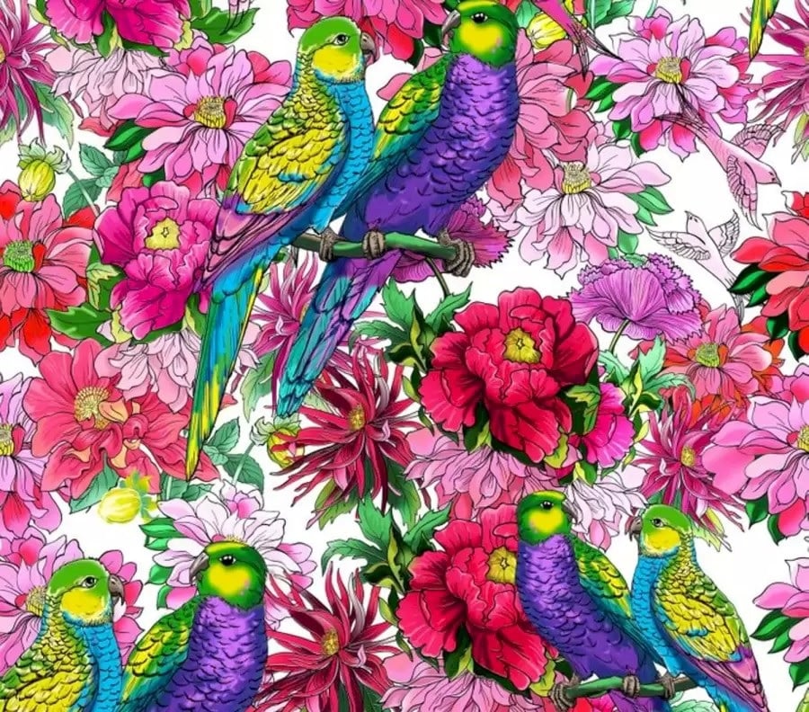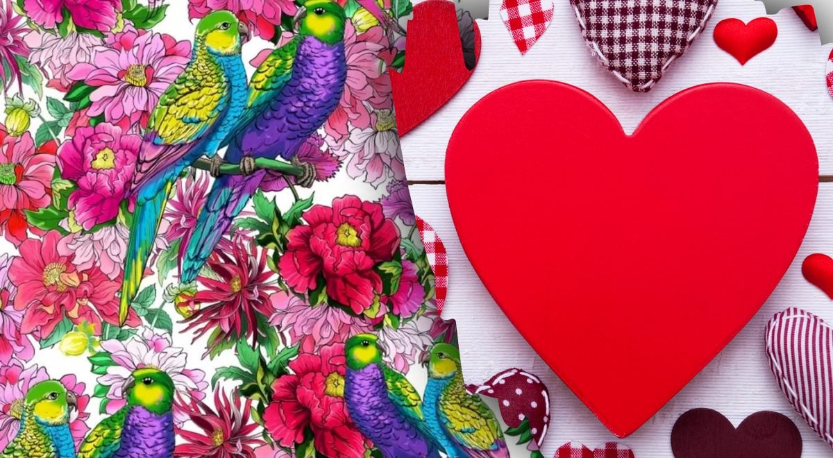 Foran dine øjne – et lyst billede med en masse blomster og papegøjer. Fuglene sidder parvis mellem blomsterne. Og i denne romantiske atmosfære er der et skjult hjerte et sted. Hvor det præcist er placeret, vil ikke være muligt at se.