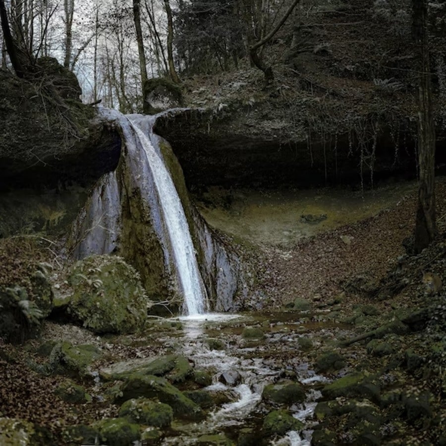 På billedet ser vi et skovlandskab med et vandfald. Vandet falder ned på de mosdækkede klipper, der ligger nedenfor. Og farveskemaet, der indrammer skoven, antyder, at billedet forestiller et efterårslandskab.