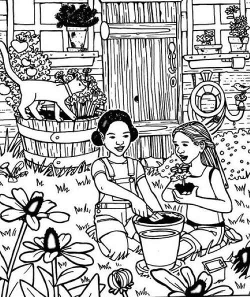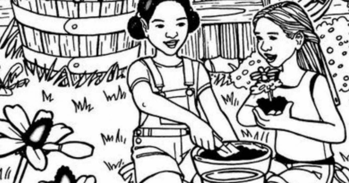 På billedet er der to piger, som er ved at plante blomster i haven på baggrund af et hus. Et sted i nærheden af dem er der en ring, og vi skal finde den.